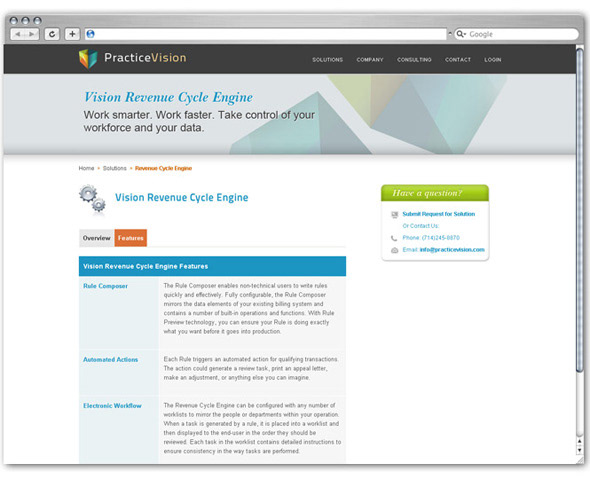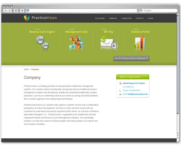 The web design’s aim is to be simple, user friendly, and uniformly branded. One of my major objectives was to design custom navigation icons on the home page with the goal of introducing site visitors to PracticeVision’s product suite as soon as they arrive at the homepage.